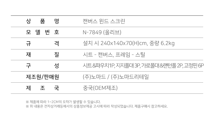 노마드 캔버스 윈드 스크린 올리브 차박 휴대용 캠핑 용품 N-7849