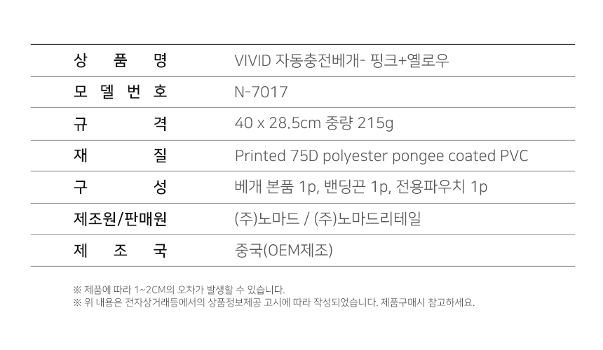 노마드 차박 휴대용 캠핑용 VIVID 자동 충전 베개 (핑크+옐로우) N-7017