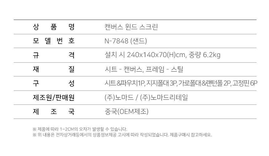 노마드 캔버스 윈드 스크린 샌드 차박 휴대용 캠핑 용품 N-7848