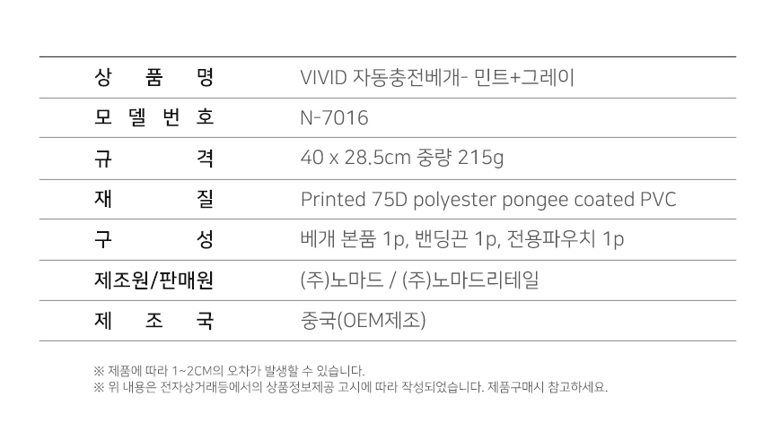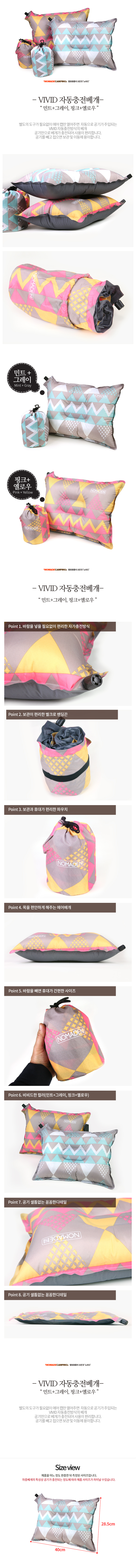 노마드 차박 휴대용 캠핑용 VIVID 자동 충전 베개 (민트+그레이) N-7016