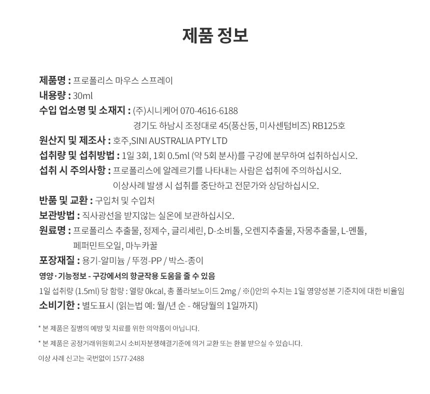 원재료명 및 함량 프로폴리스추출물, 정제수, 글리세린, D-소비톨, 오렌지추출물, 자몽추출물, L-엔톨, 페퍼민트오일, 마누카꿀