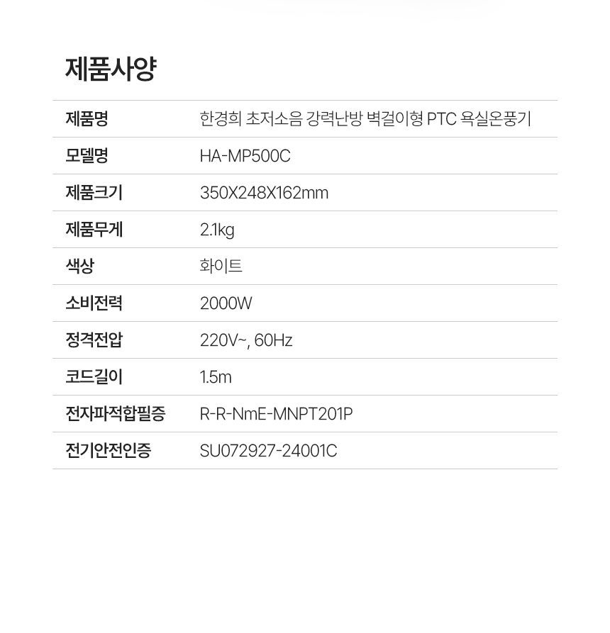 | 품질보증기준 | 제품 이상 시 공정거래위원회 고시 소비자분쟁해결기준에 의거 보상합니다. |