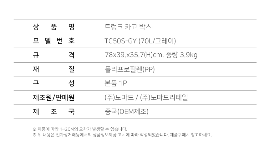 노마드 TRUNCK 카고 박스 70L 그레이 휴대용 캠핑 용품 TC70S-GY