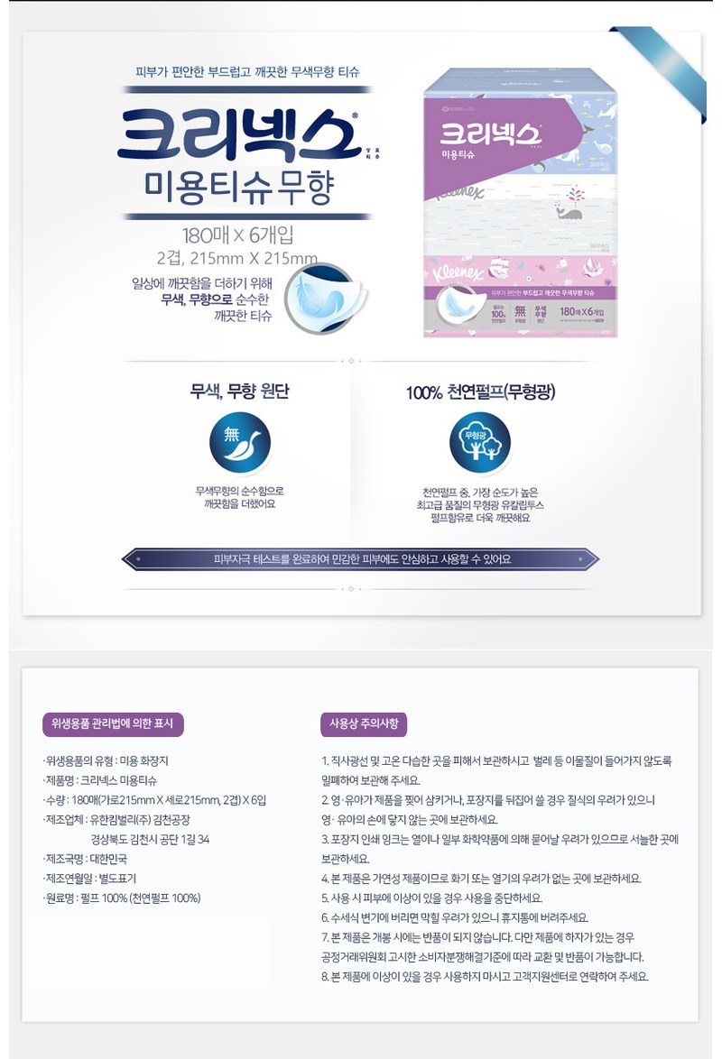 [크리넥스] 무색무향 각티슈 180매 6개 2팩