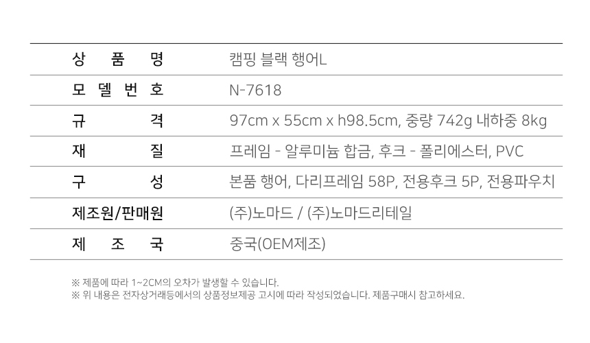 노마드 캠핑 휴대용 블랙 행어(L) N-7618 N-7618